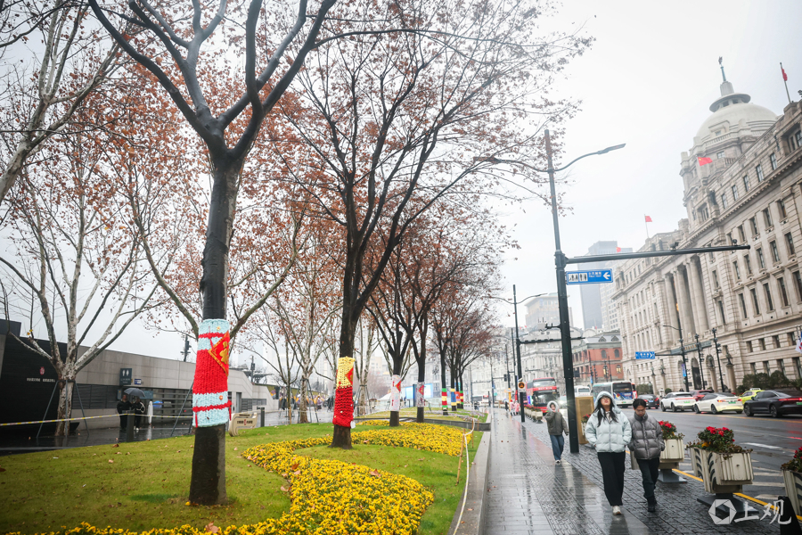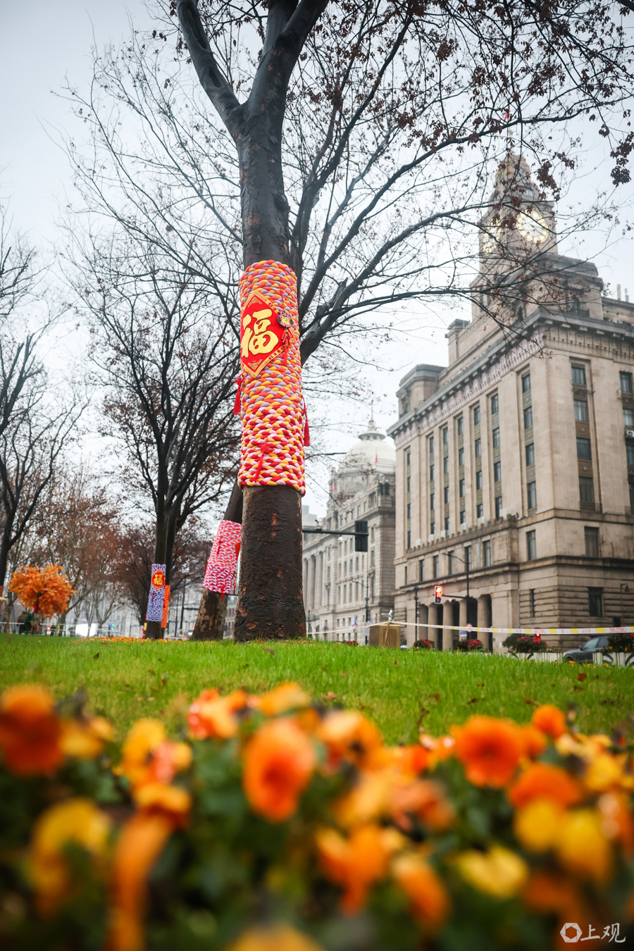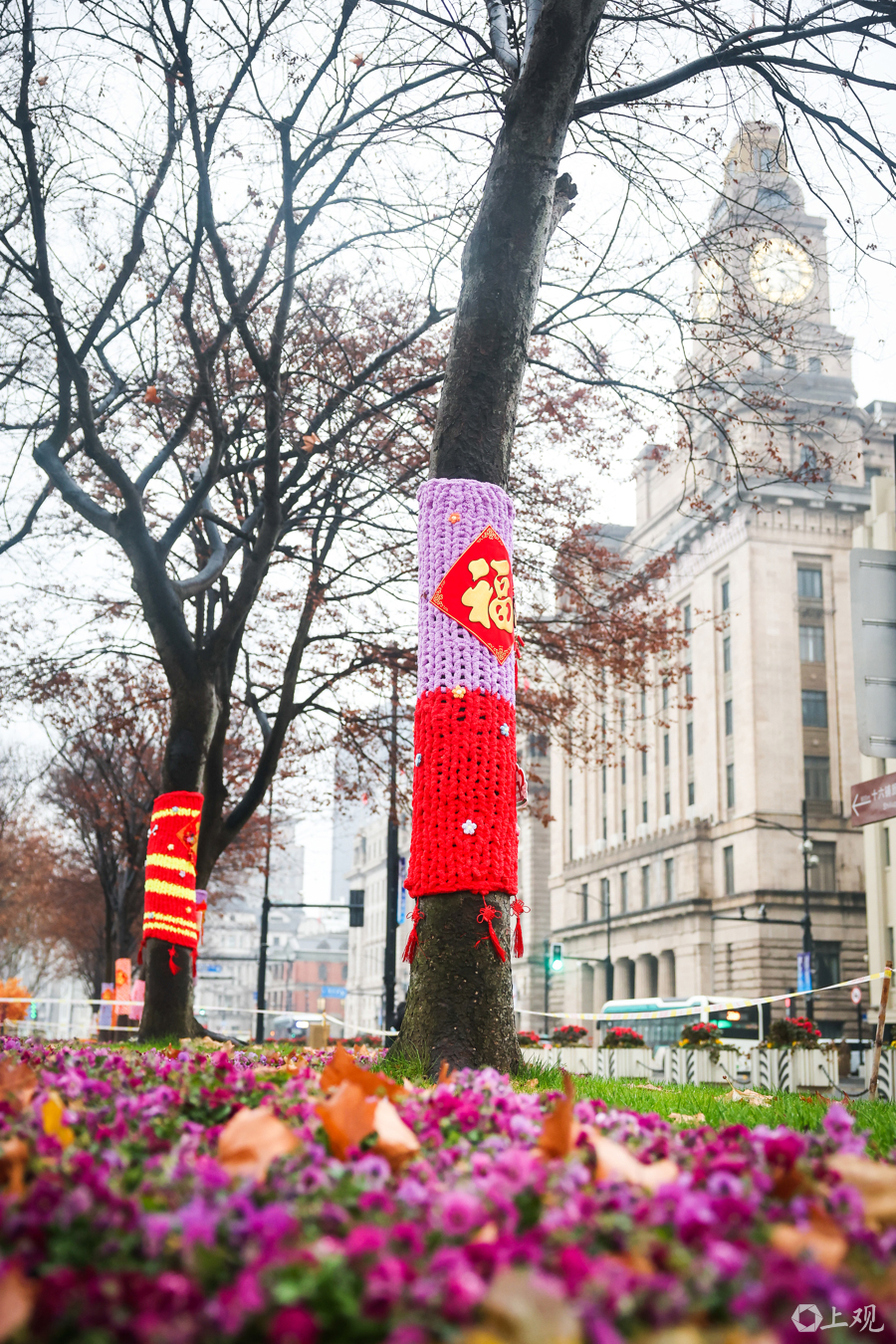 近日,上国外滩沿线行谈树悄然换上“寒衣”——一件件色调斑斓的手工编织毛线织物将树干包裹,为这片历史设置群林立的街区增添了慈祥灵动的艺术气味。