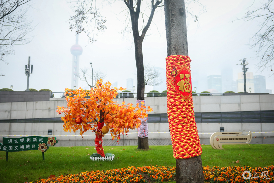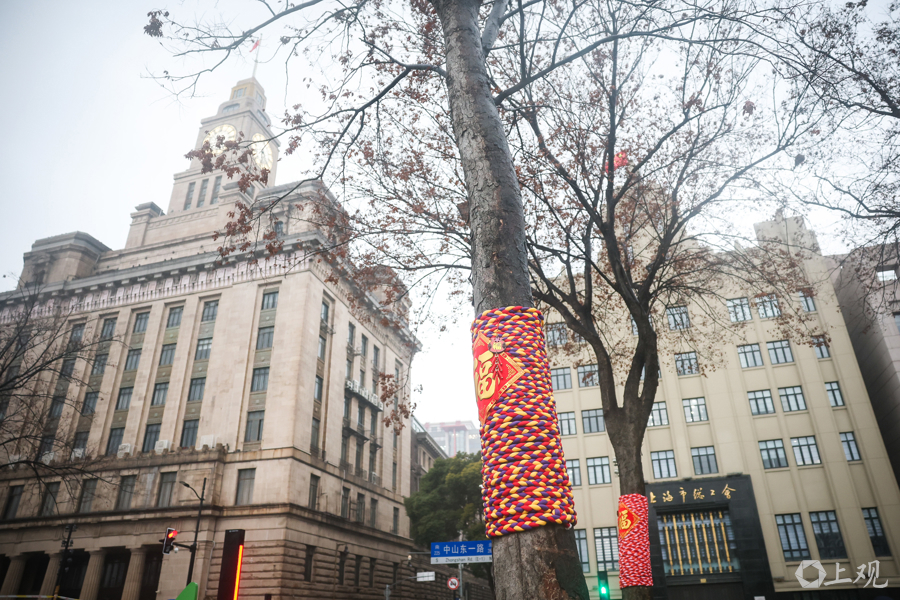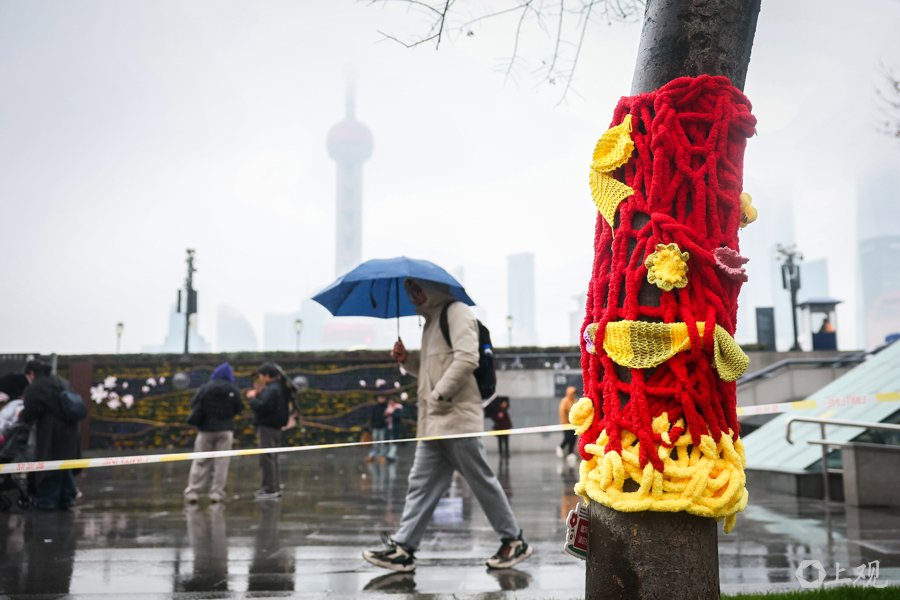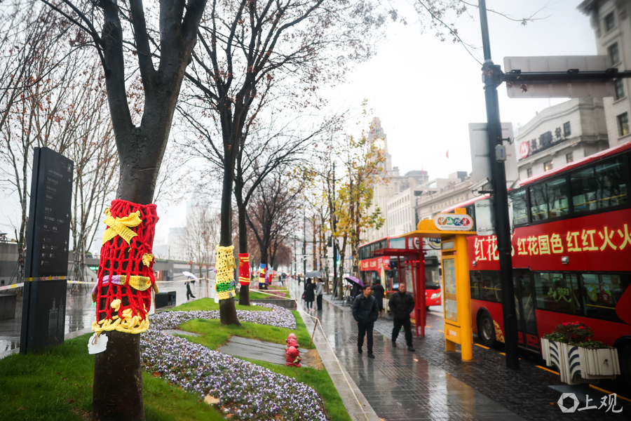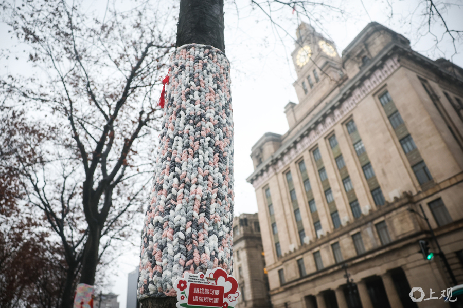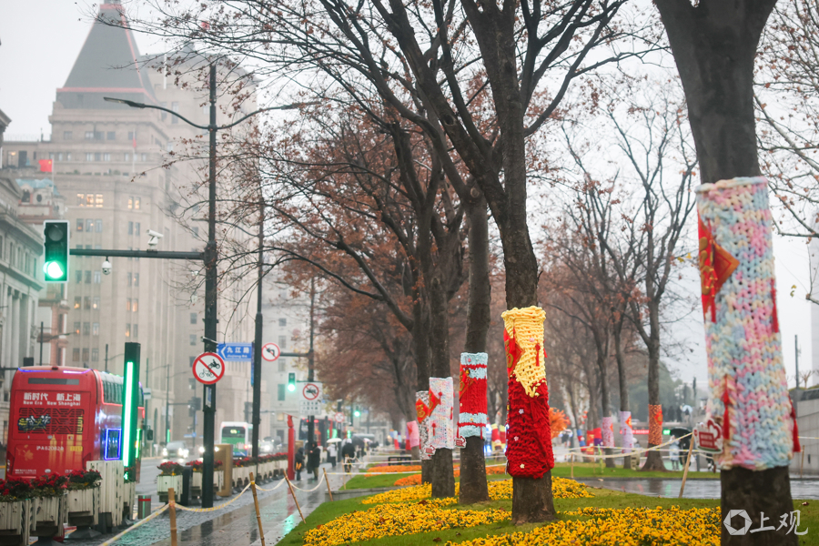 近日,上国外滩沿线行谈树悄然换上“寒衣”——一件件色调斑斓的手工编织毛线织物将树干包裹,为这片历史设置群林立的街区增添了慈祥灵动的艺术气味。