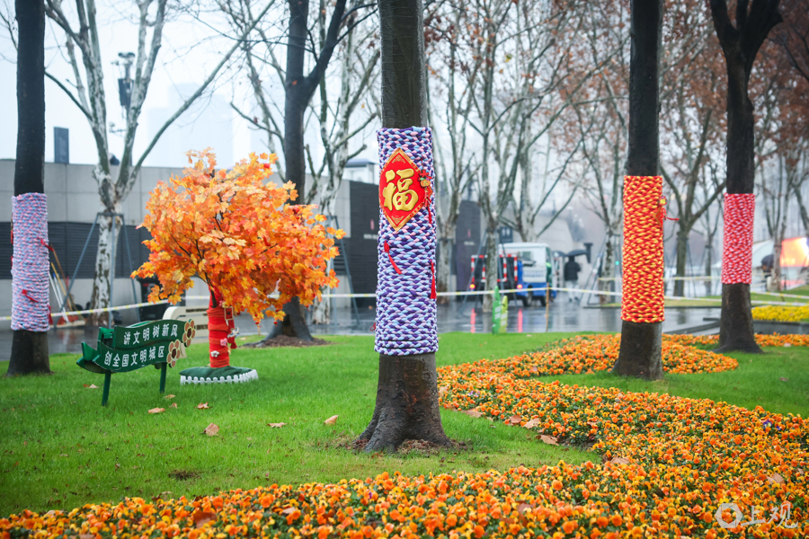 福字、灯笼、传统斑纹等图案点缀其间,既为树木防寒御寒,又提前营造出浓浓的年节氛围,成为市民旅客竞相打卡的冬日新景。